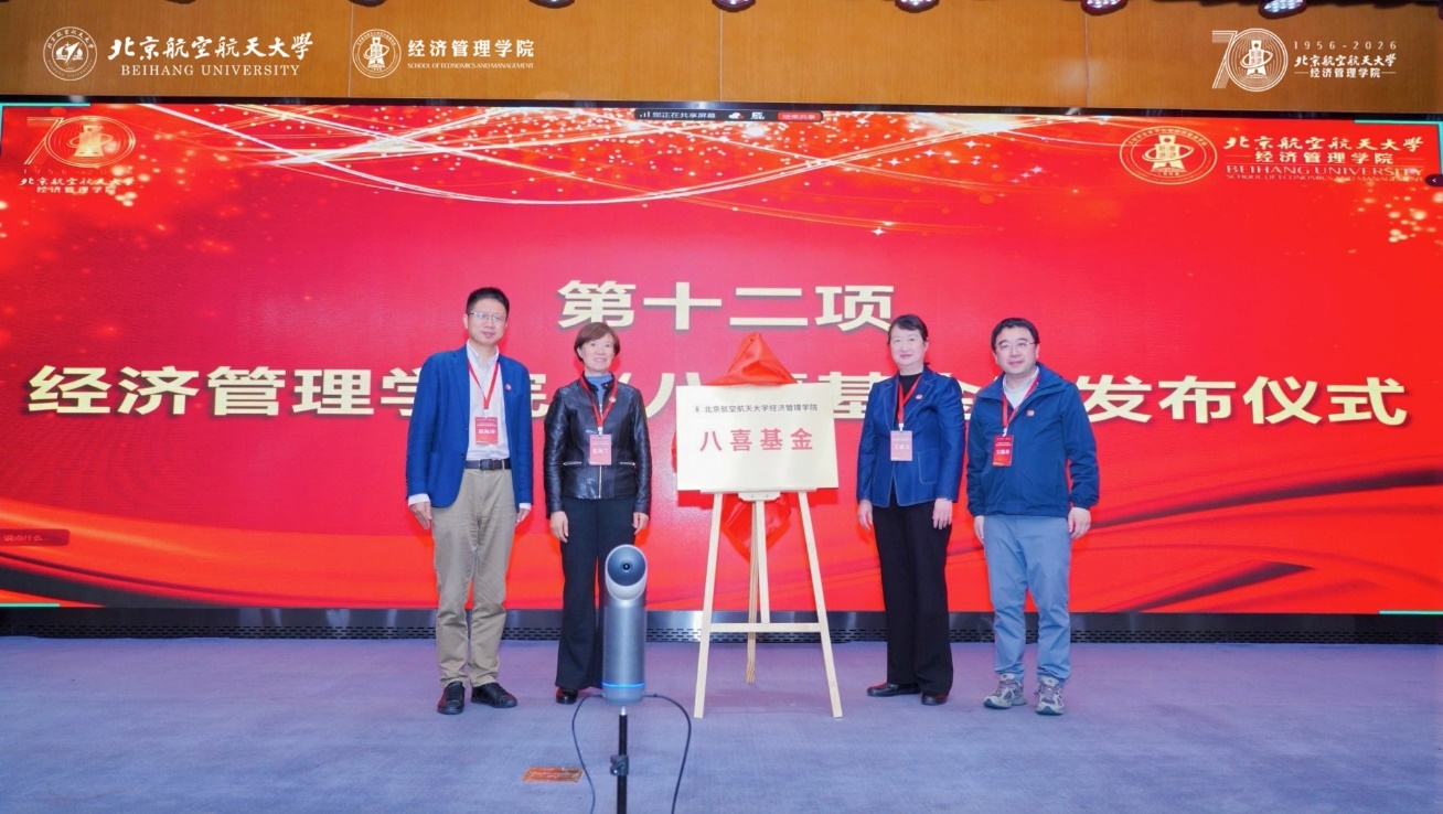 本次大会举行了经济管理学院“八喜基金”发布仪式,北航原副校长、校务委员会副主任张海兰,计划财务部部长兼学科发展办公室主任吴瑞林,经济管理学院原院长王惠文,学院党委书记郑海涛共同为基金揭牌。该基金专项用于学生社会实践、科研竞赛、奖学金评定、创新创业扶持等人才培养工作,旨在汇聚海内外校友爱心力量,为青年学子成长成才保驾护航,为学院学科建设、教育教学高质量发展注入持续动能。